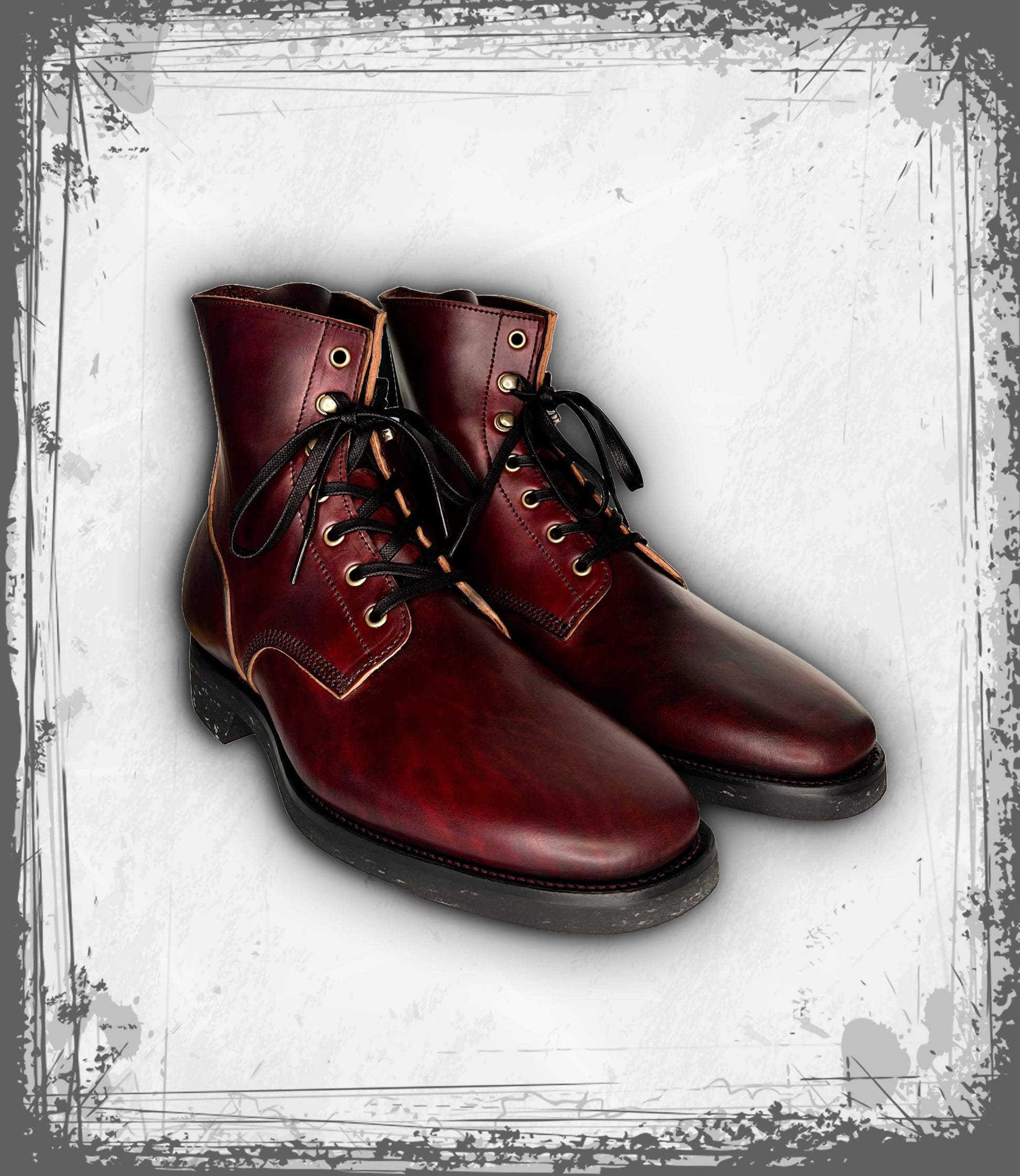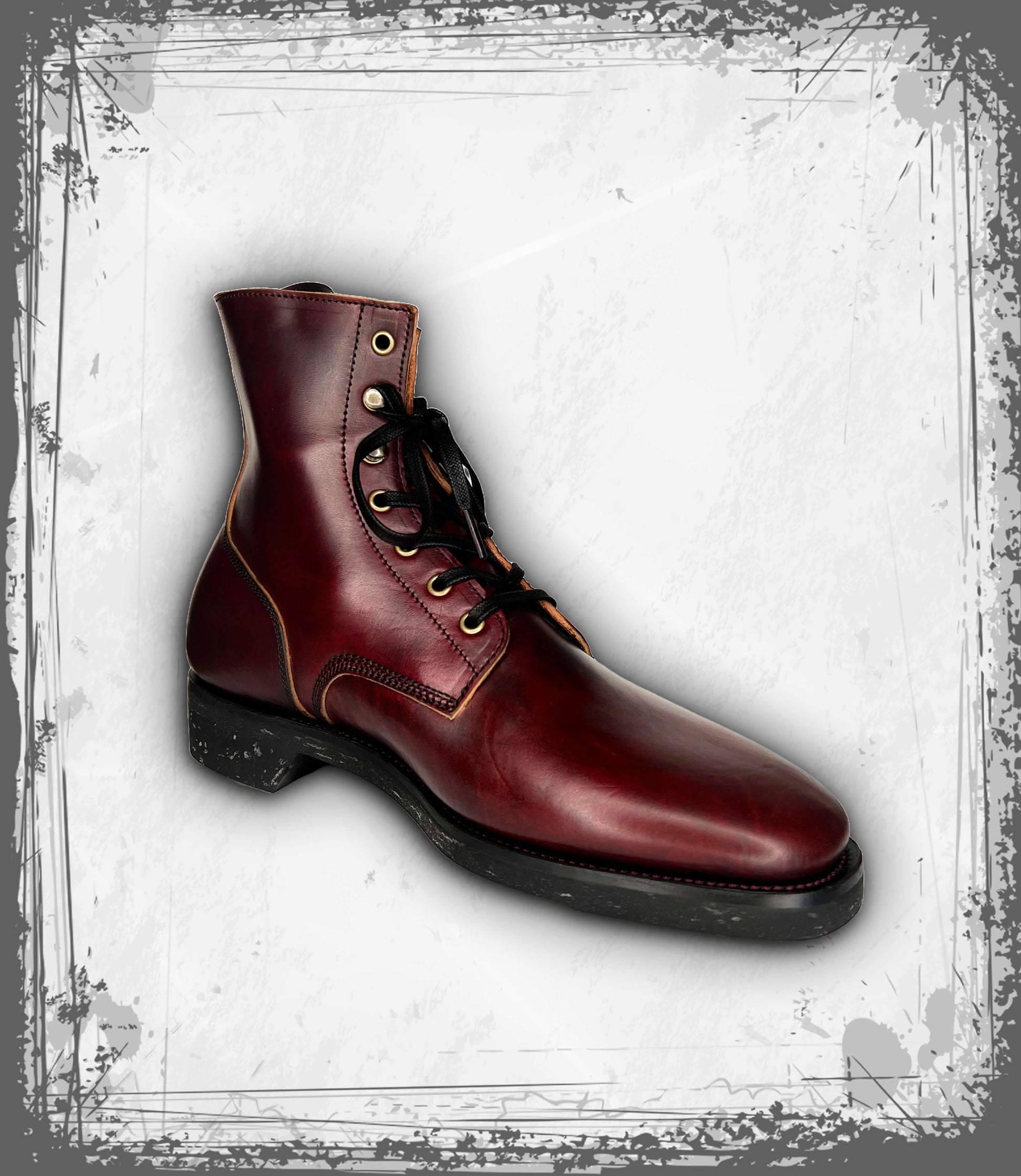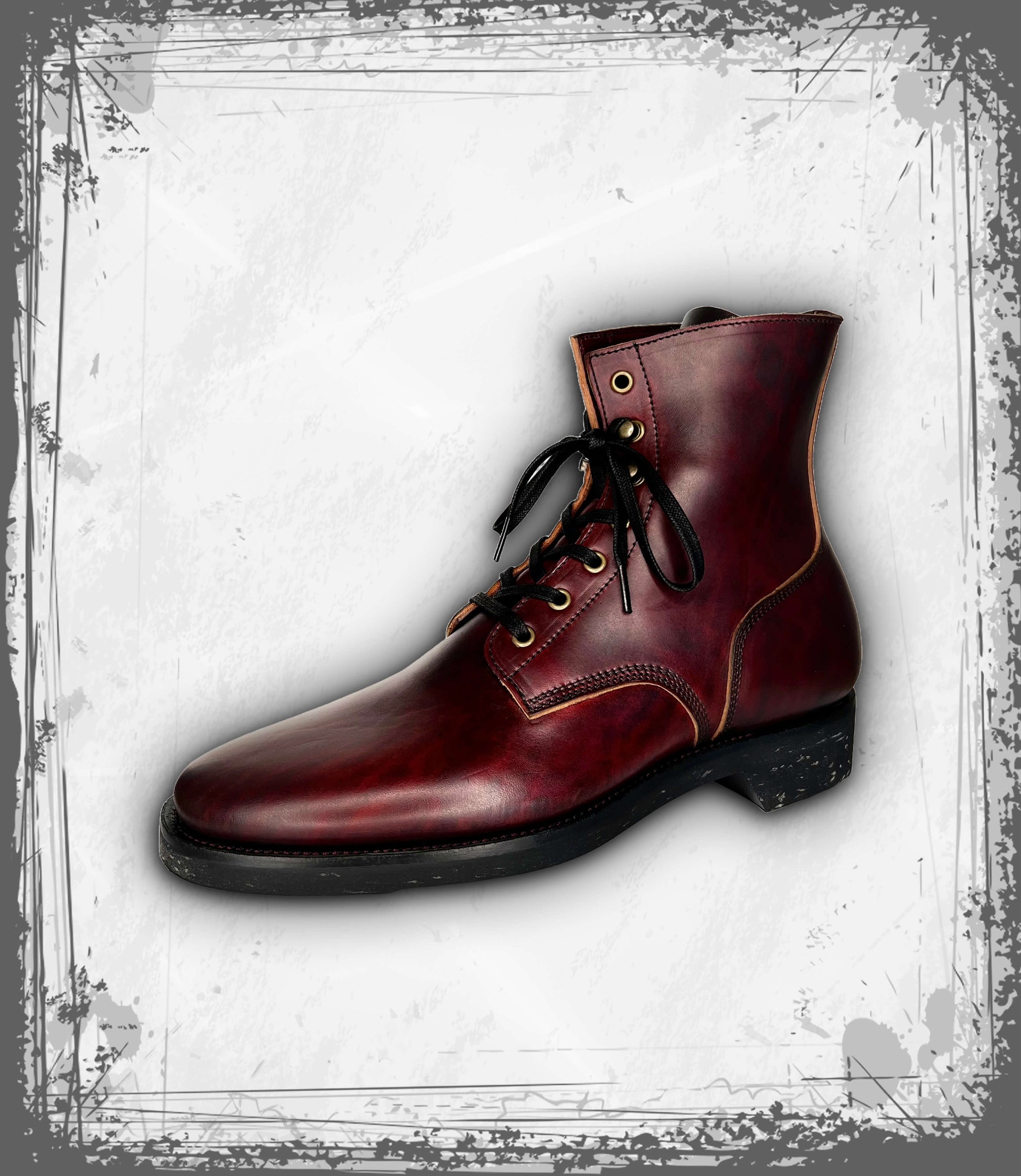 Handmade, hand-lasted and hand-welted Boondocker boots with 6.5-inch tall ankle shaft in Burgundy & Sumi-dyed “House Cab” Horsebutt made on our Hank last with Flat Waxed Cotton laces. Horsebutt leather base vegetable tanned by Guidi & Rosellini tannery in Santa Croce, Tuscany, Italy, and hand-dyed & finished by us in Long Beach, California USA.