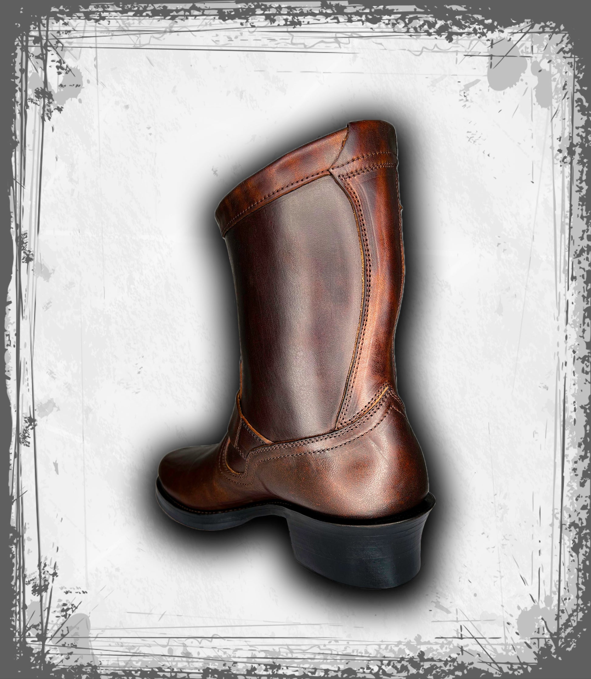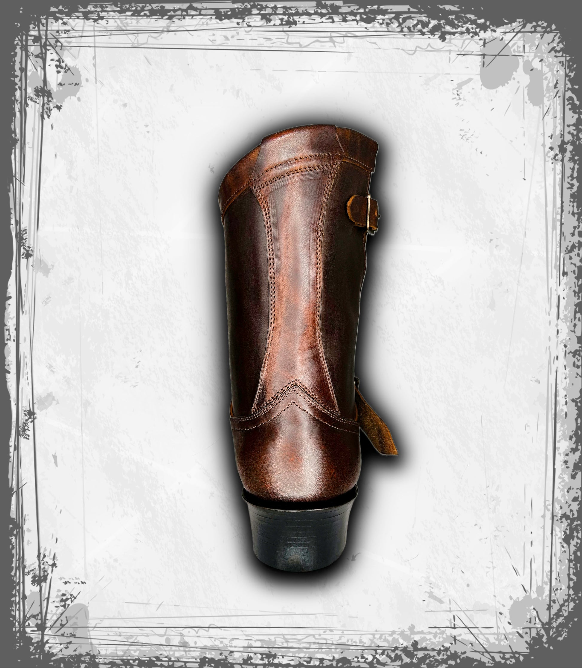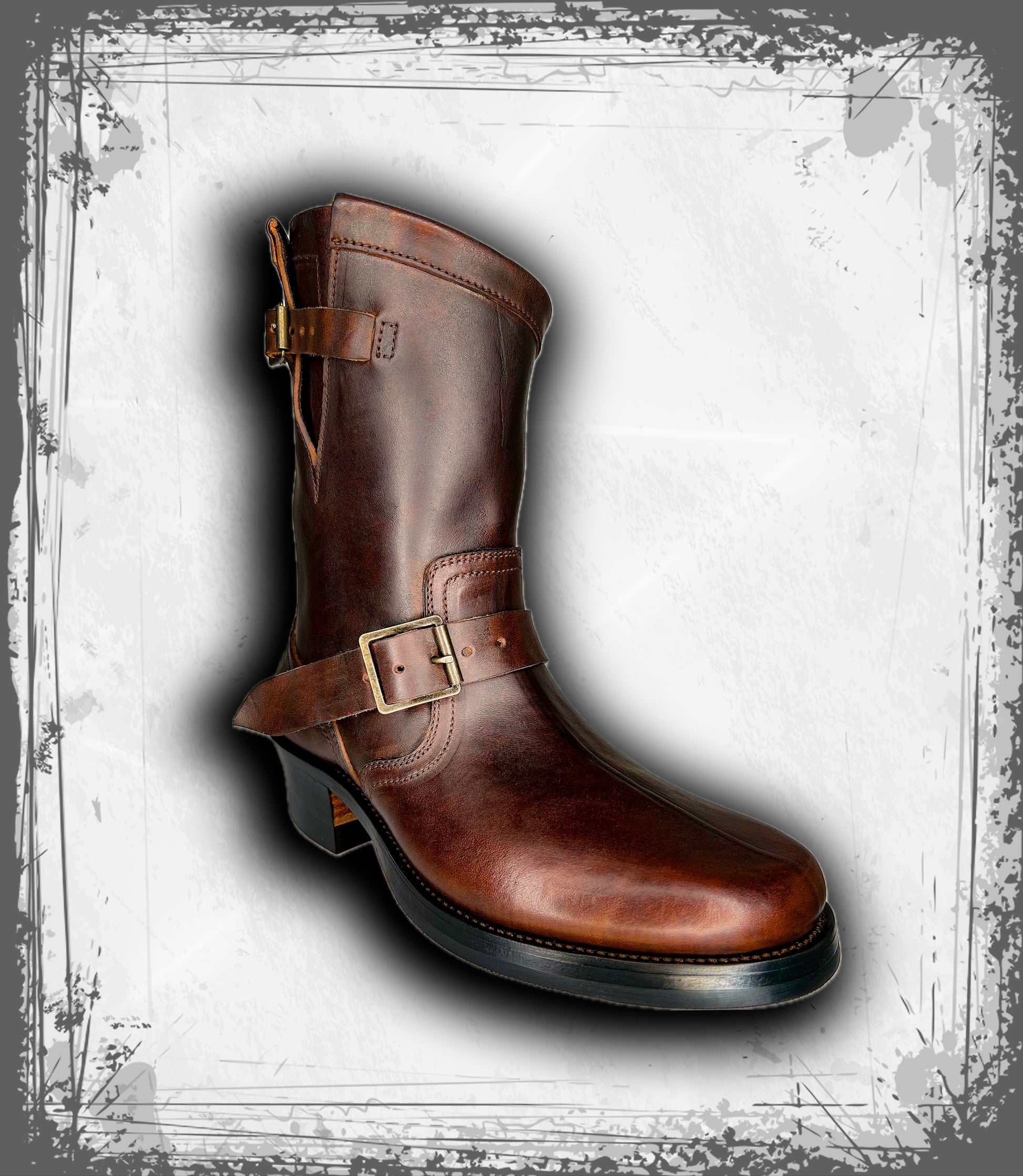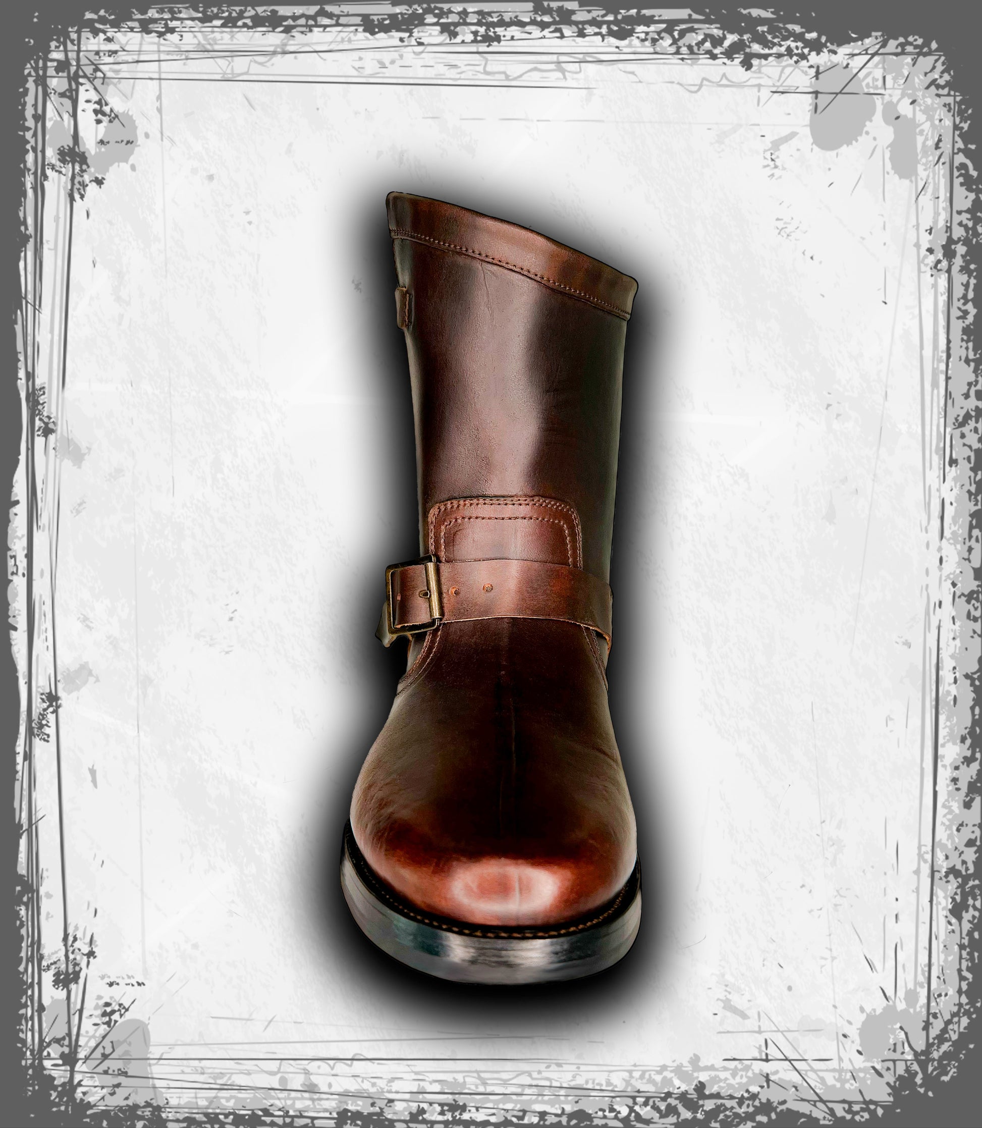 Completely handcrafted whole-cut vamp & heel Engineer boots with 11-inch shaft and heavy gauge Polished Nickel or Polished Brass finished Vintage style brass buckles in hand-dyed “Dirty” Horsebutt made on our Waylon last. Horsebutt leather base vegetable tanned by Guidi & Rosellini tannery in Santa Croce, Tuscany, Italy, and hand-dyed & finished by us in Long Beach, California USA.